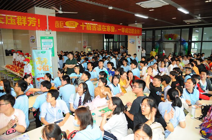 精心的布置,美味的糕点。在三中一楼校园餐厅里,超多美味等待着高三学子前来品尝。舌尖上的美味,是三中送给同学们的一份“甜蜜大礼”。现场有“马到成功-金榜题名”的超长型大蛋糕,还有水果、糕点、气球、许愿墙。