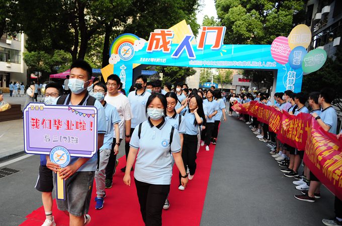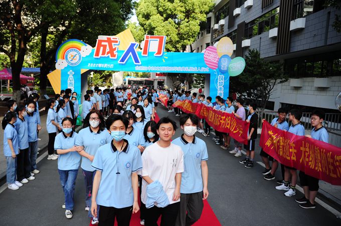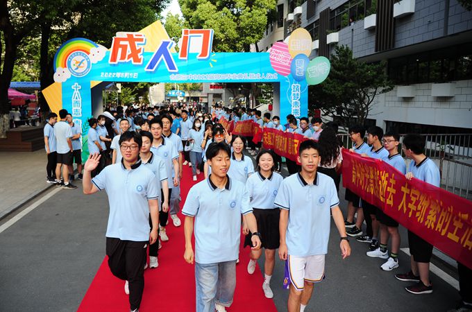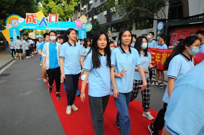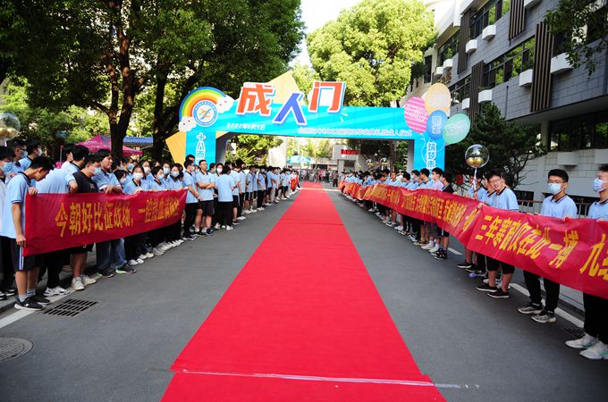 豪情壮志鸣号角,青春誓言响云霄。高三同学在班主任的带领下,走上红毯,向着成人门前进。沿路夹道送行的是高一高二的学弟学妹们,在他们的见证下,高三学子跨过成人门,踏上新征程。