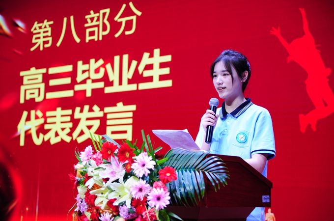 来自高三(7)班的陈家慧同学代表全体高三学生表达了对老师和母校的感谢之情,同时也表达了继续努力学习,不断追求卓越,积极为母校增添光彩的决心。在音乐声中,学生代表为高三全体教师献上感恩之花,表达最衷心的感激之情。在离别之际,高三学生代表合唱了一首《祝你一路顺风》,为每一位即将告别母校的学子,送去最美好的祝福。