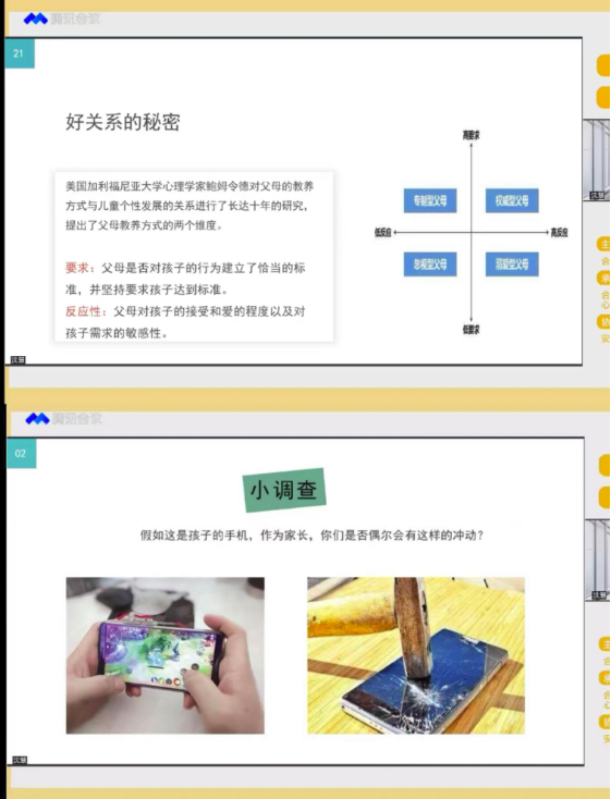 讲座由高级家庭教育指导师沈慧老师主讲。沈老师首先从手机使用大数据进行了数据分析,通过设置现场互动方式直观地了解了学生及家长使用手机的概况,其次通过对手机成瘾背后的心理机制的分析,让家长们客观了解了学生离不开手机的种种原因,最后再通过手机时代的亲子沟通方式的分析让家长们进一步了解手机在亲子沟通中作用。