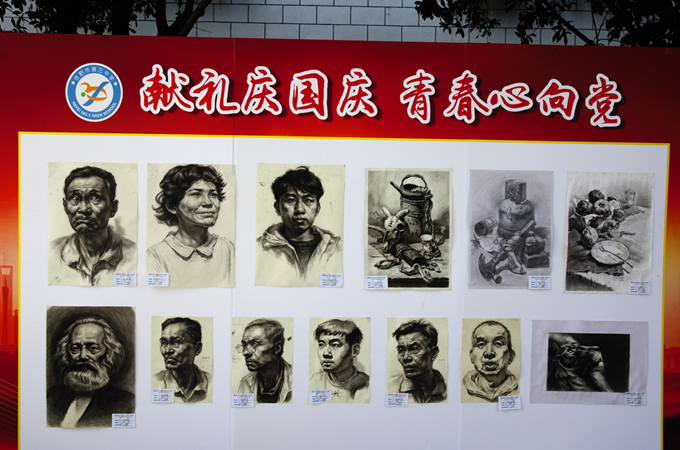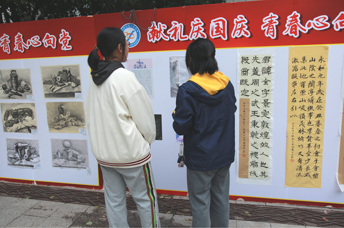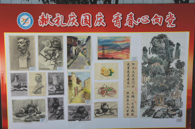 本次活动得到了同学们的积极响应,有近两百名同学踊跃报名参加。同学们提交了书法、版画、国画、素描、水彩等形式多样的作品。经政教处、美术组选拔评比,最终遴选出八十余份优秀作品进行展出。展出作品风格鲜明、各具特色:有方正规矩的楷书,有飘逸清秀的行书,有气势磅礴的山水画,有唯美写实的素描。每一抹色彩都映射出同学们对祖国的祝福,每一笔丹青都显示出同学们对祖国的礼赞。