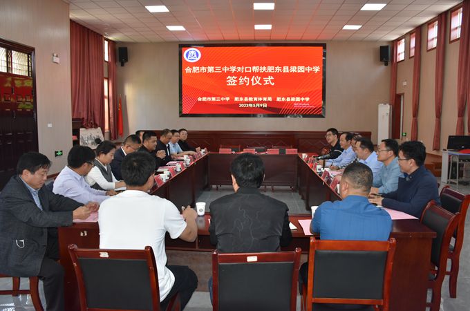 2023年5月9日下午,合肥市第三中学与肥东县梁园中学举行结对帮扶签约仪式,缔结友好合作关系。肥东县教体局领导以及两所学校的领导班子等20余人参加了此次签约仪式,梁园中学党支部书记音邦明主持了此次签约仪式。