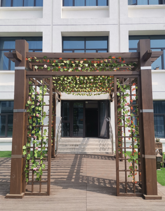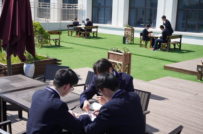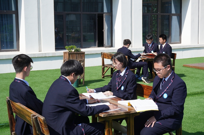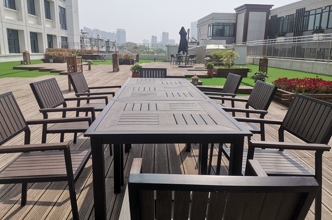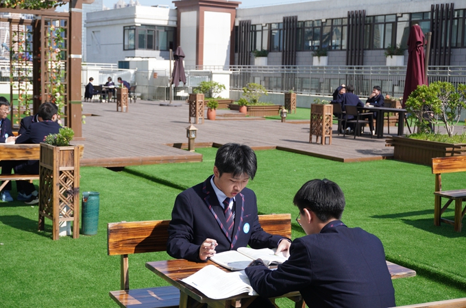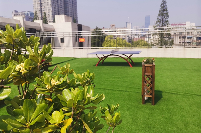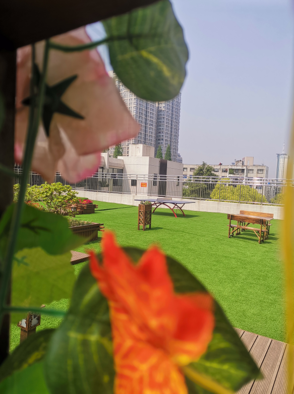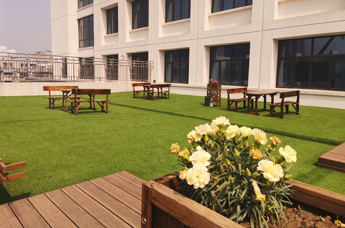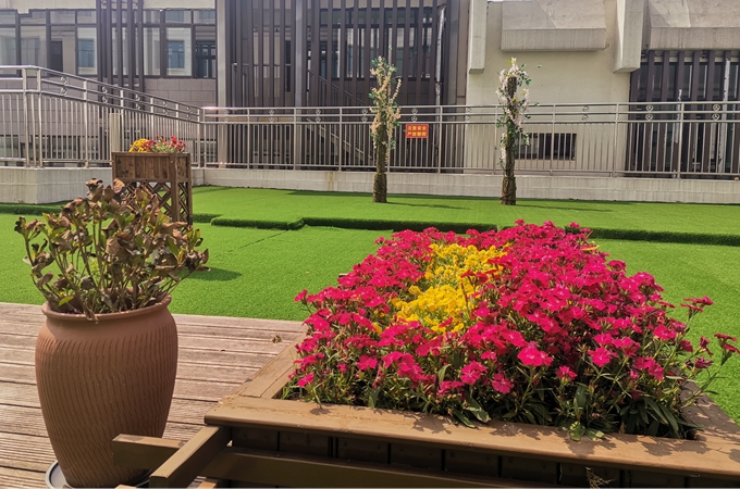 空中花园位于学校新建正谊会堂楼顶,面积约1000m2。排气管上巧妙地设计了草坪灯,诸多花箱栽种了各式花草,休闲桌椅和遮阳伞便于同学们休憩。