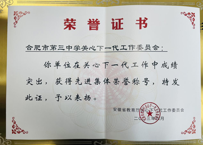 近日,安徽省教育厅关心下一代工作委员会表彰了全省教育系统关心下一代工作先进集体、先进工作者和突出贡献奖,合肥市第三中学关心下一代工作委员会荣获安徽省教育系统关心下一代工作“先进集体”称号。