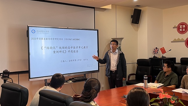 为有效开展课题研究工作,明确课题研究方向,辐射带动教学教研提质,点点手机版下载官网app于2023年10月24日下午15:00在君尧楼九楼会议室召开省级课题《“结构化”统领的高中数学单元教学案例研究》开题报告会。会议邀请了合肥师范学院数学与统计学院王家正教授、沈南山教授。点点手机版下载官网app教科室主任郑书建、教科室副主任袁艳、课题组全体成员参加会议,会议由教科室主任郑书建主持。