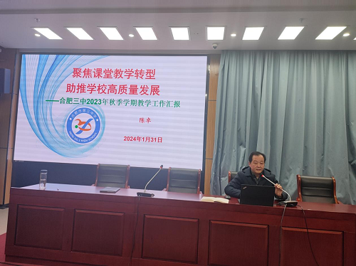 副校长陈卓以《聚焦课堂教学转型 助推学校高质量发展》为主题,就2023年教学工作进行总结。他总结本学期教学教研取得的优秀成果,对优秀教师进行表扬,他表示在新学期将继续为我校构建高品质课堂,教学质量提升而努力奋斗。