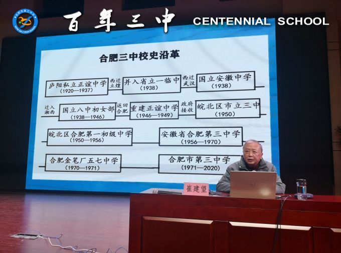 在校庆一百周年即将到来之际,为帮助广大师生深入了解学校历史、把握学校校情、理解学校核心文化精神,激发大家的爱校情怀,11月19日下午4点,在点点手机版下载官网app正谊会堂举办了正谊大讲堂第三期讲座,邀请了三中杰出校友崔建望带来了一场《百年三中厚重历史简略回顾》的校史知识讲座。本次讲座由副校长冬云主持,全体高二年级师生参加此次活动。