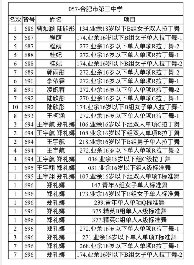 我校体育舞蹈代表队由陈卓副校长为领队,唐正现,陈磊老师为指导,派出郑礼娜、王宇翔、程萌、王宇航、曹灿颖、陆欣彤、凌婉蓉、桂妃、王柯涵、李依霖、郭雨彤、李木子12名队员参加了拉丁舞业余组及标准舞青年组、精英组别的赛事。经过第一轮的海选和最后的决赛,共获得8个项目第一名,4个项目第二名,1个项目第三名和多项目前八名的好成绩。其中2020级体育舞蹈特长生郑礼娜同学在本次比赛中充分发挥其标准舞优势斩获7个第一名的绝佳成绩。2021级体育舞蹈特长生程萌同学分别从各市21支单人拉丁舞和24支单项伦巴参赛者中脱颖而出获得第五名的可喜成绩。
