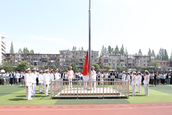 仪式第一项,升国旗。随着庄严的国歌响起,在场的师生神情庄重,面向国旗肃然而立,凝视鲜艳的五星红旗冉冉升起。