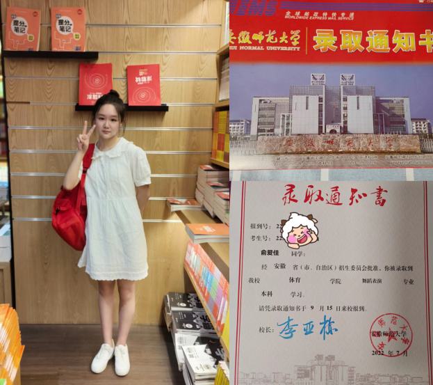 我是从小学准备上一年级的暑假就开始学习拉丁舞了,当时是因为看见大哥哥大姐姐在舞台上表演十分耀眼,就让妈妈给我报了舞蹈班。一开始,我是一个害羞的小女孩,后来参加了很多市里、省里的比赛,渐渐变得开放了起来。上了初中后学业繁忙,暂时放弃了拉丁舞的学习,但我对其热爱程度丝毫未减。高二阶段我在为文化课发愁时,一次跟班主任慧姐聊天中,发现拉丁舞可以读更好的大学。于是经过我和父母的慎重考虑,决定重拾拉丁舞的学习。后来发现,艺考不仅要学习拉丁舞还要练习健美操。终于,通过老师们的悉心教导,家人的支持,以及我自己的努力,圆了我的安徽师范大学梦!Where there is a will, there is a way。希望学弟学妹们也能考上心仪的大学。