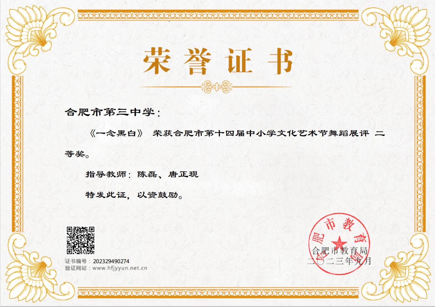 近日,2023年合肥市第十四届中小学文化艺术节展评结果公布,合肥市第三中学舞蹈作品《一念黑白》荣获二等奖。