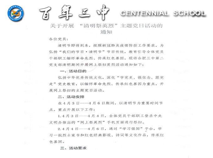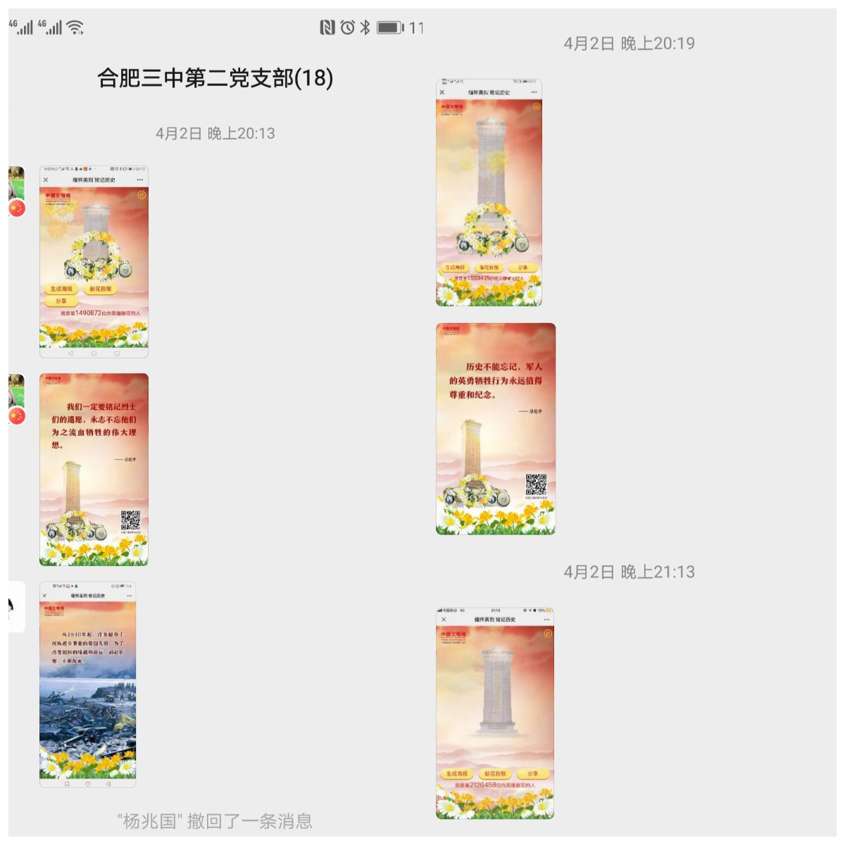 习总书记说:“祖国是人民最坚实的依靠,英雄是民族最闪亮的坐标。”回眸五千多年历史长河,伟大的中华民族生生不息、绵延发展,饱受挫折又不断浴火重生。注目凝望,一个接一个英雄的名字跃然而出,如同最醒目的坐标点亮一段又一段刻骨铭心的民族记忆。活动中,支部党员通过利用电脑、手机走进网上英烈纪念馆,进一步了解了烈士们为祖国为人民抛头颅、洒热血,不惜牺牲的感人事迹,更深刻地体会到了先烈们那种坚贞不屈、英勇无畏的高贵品质。全体党员通过中央文明办推出的“网上祭英烈”活动专栏,开展了网上祭奠、献花,抒写感言活动,表达对英烈们的崇敬和感恩之情。第二支部还坚持党建带团建,支部组织委员闫大钊老师,组织年级部分优秀团员代表赴渡江战役纪念馆,缅怀英烈。