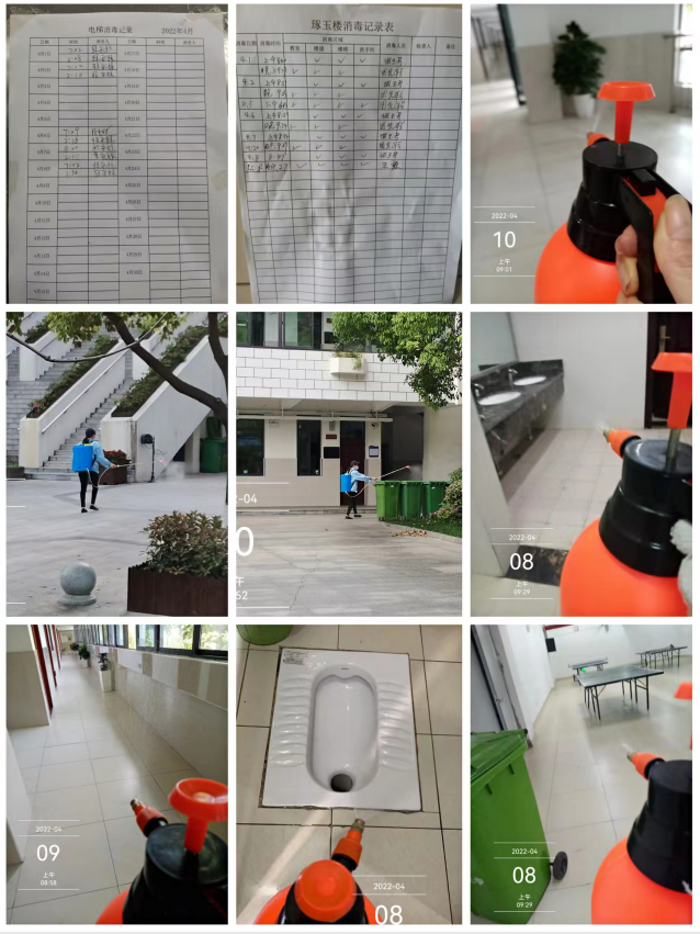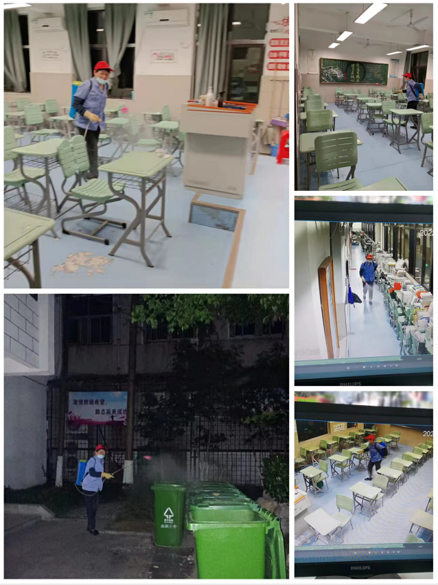 白天物业公司组织多名工作人员对校区内道路、垃圾桶、电梯、地库、楼层及运动场所进行消杀,不放过任何一个死角,为全校师生筑起一道守护平安的“防疫墙”。 晚自习过后,在夜幕中还要对教室、楼道、垃圾桶进行二次消杀,严把疫情防控关。